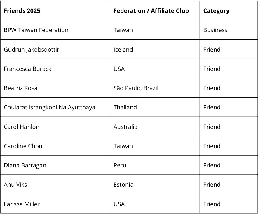 The BPW International encourages affiliates and members to become Friends of BPW International to support the organization financially in addition to their membership dues with an annual contribution.